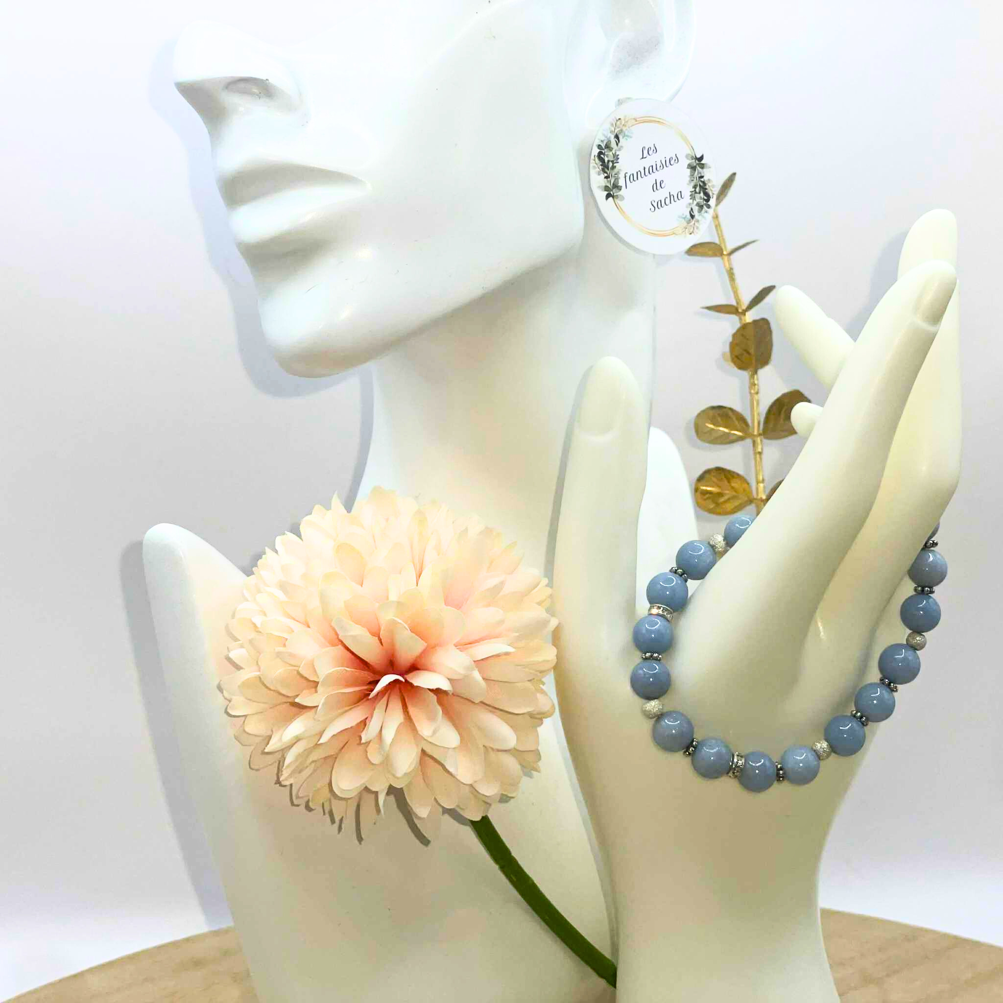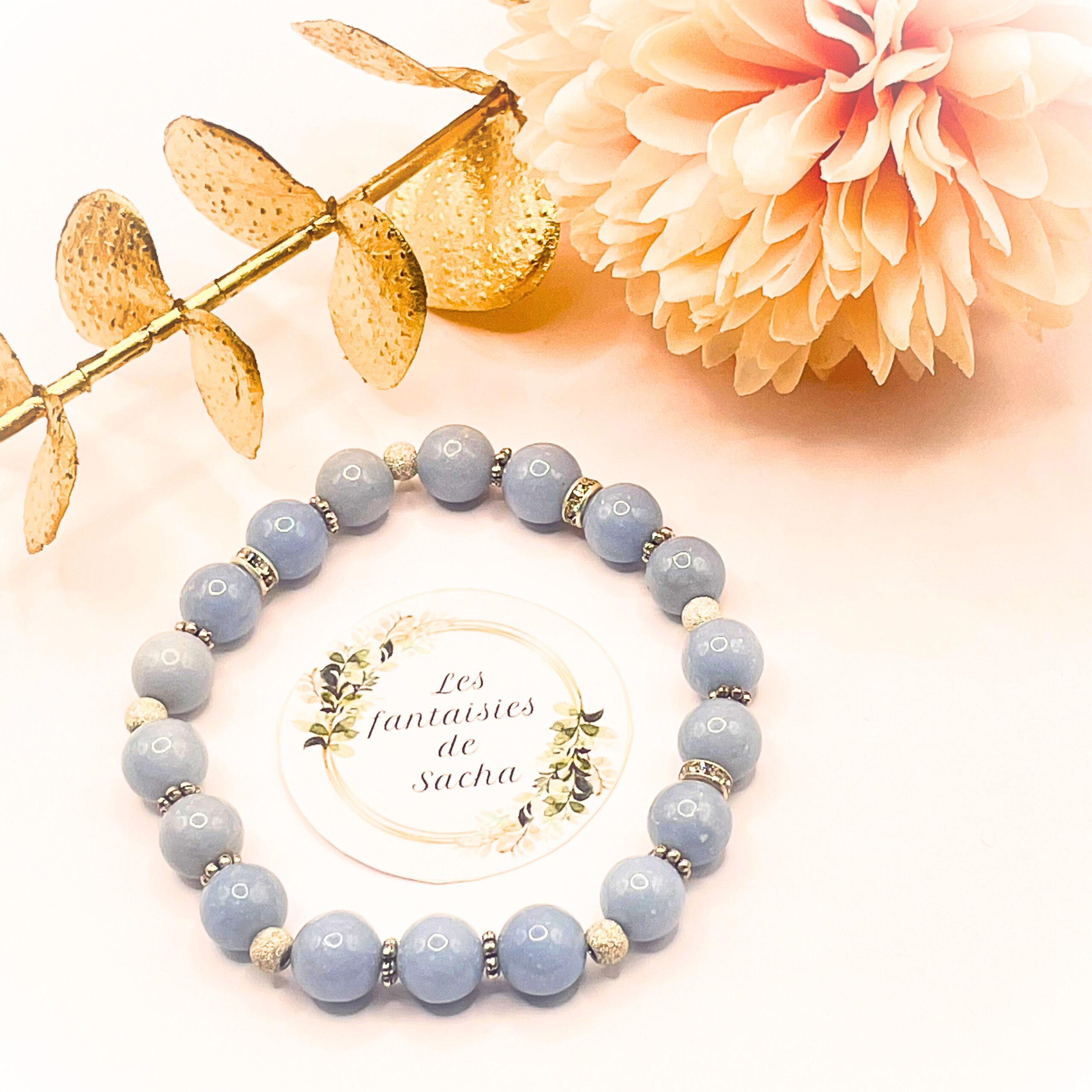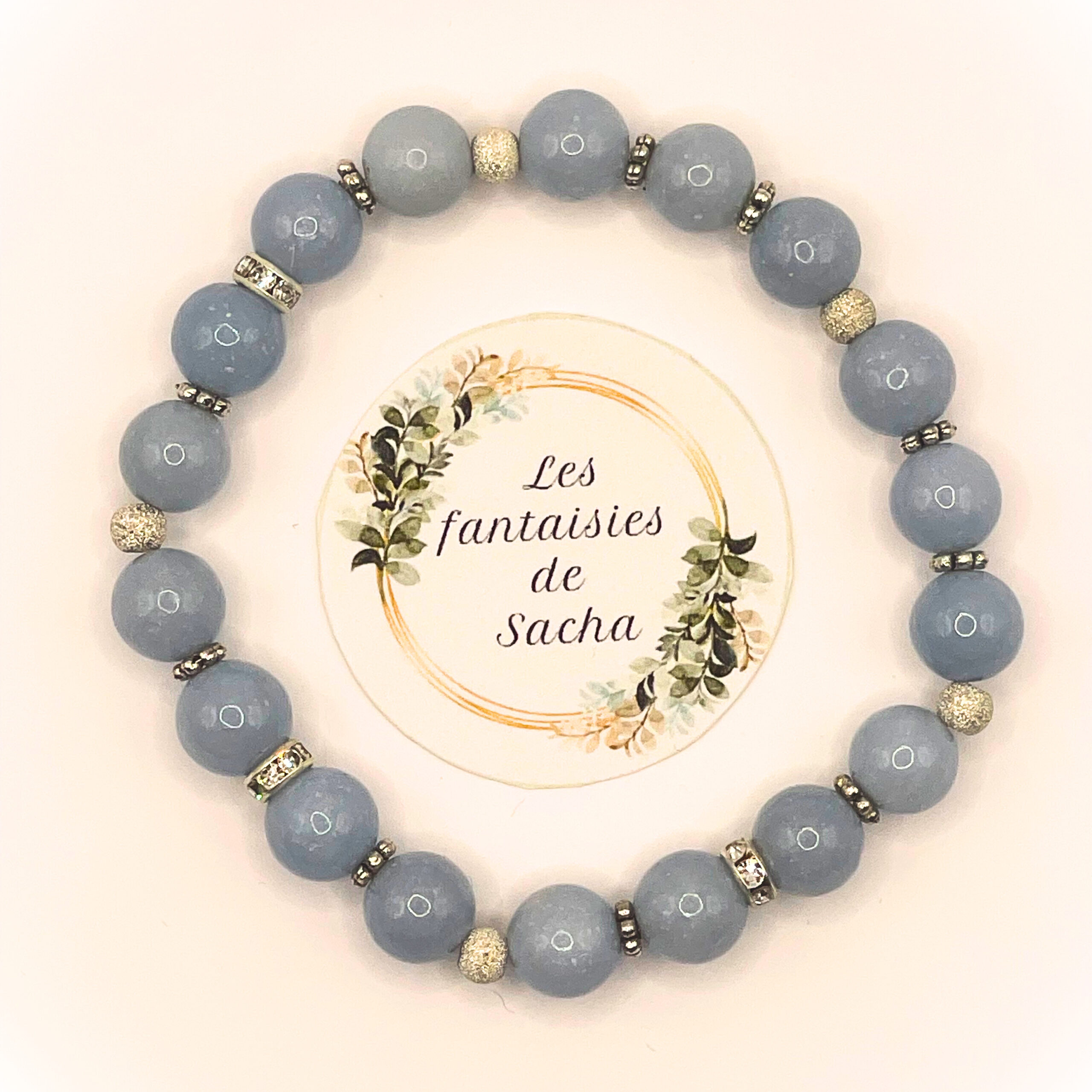 Ce « bracelet essentiel » de la boutique Les fantaisies de Sacha est composé de perles de 8 mm en pierre naturelle d’angélite mais également de perles en argent 925. Il est monté sur un fil élastique.
