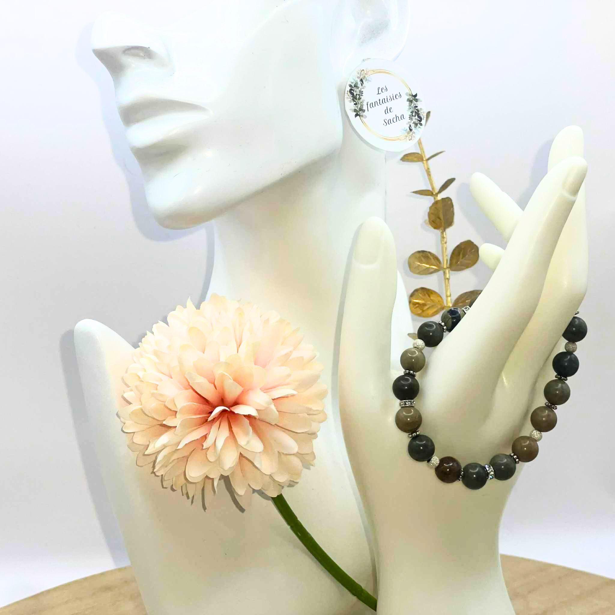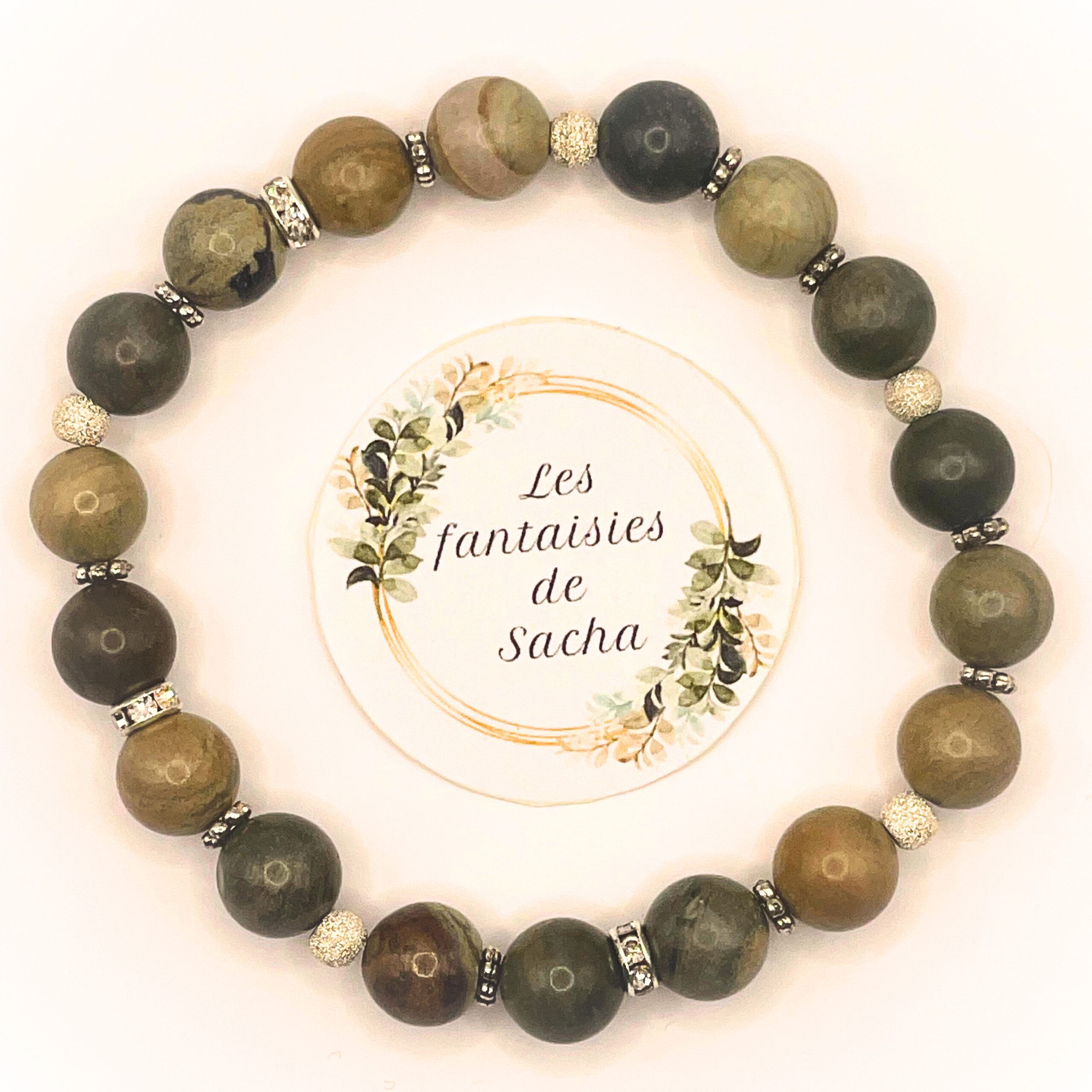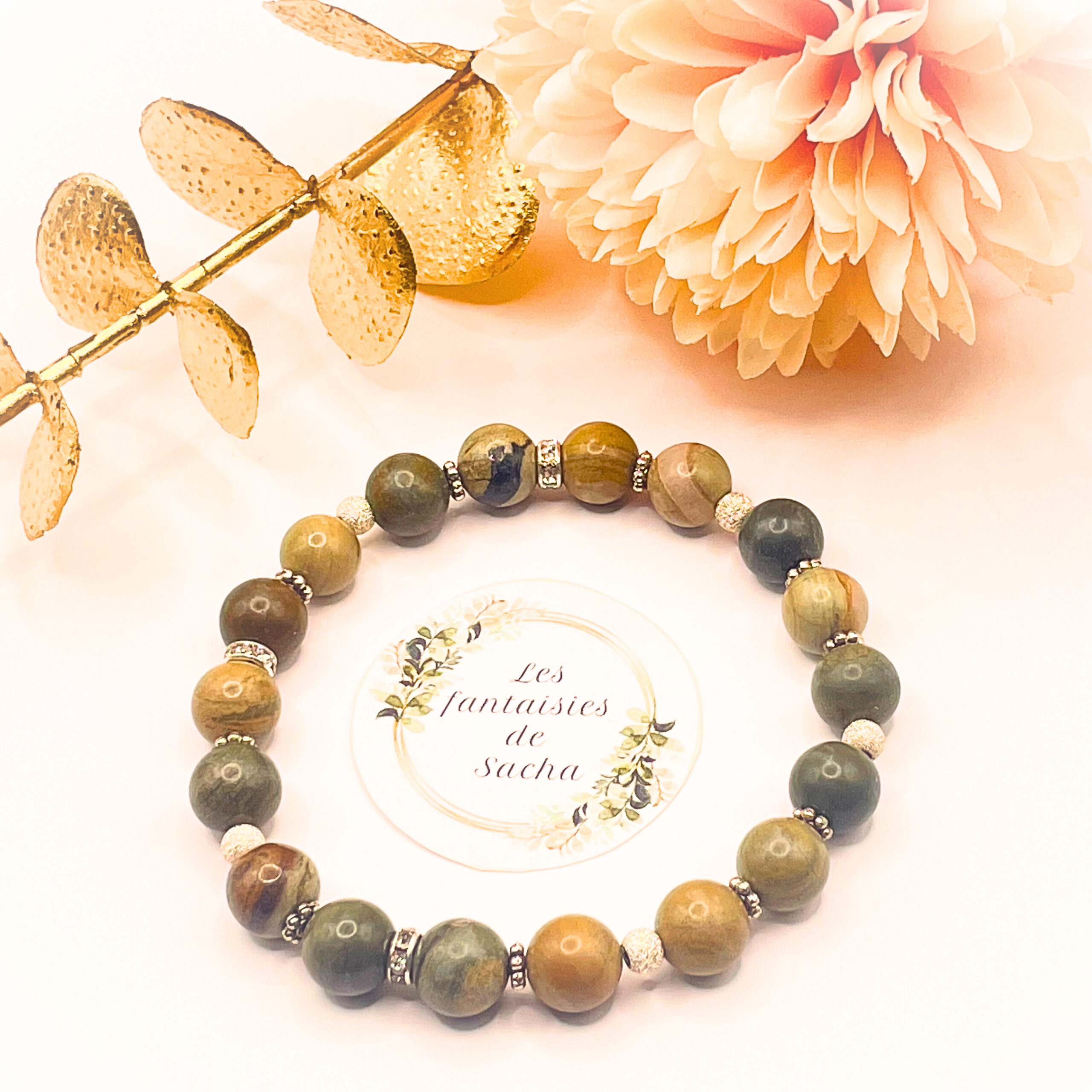 Ce « bracelet essentiel » de la boutique Les fantaisies de Sacha est composé de perles de 8 mm en pierre naturelle de jaspe feuille d’argent mais également de perles en argent 925. Il est monté sur un fil élastique.