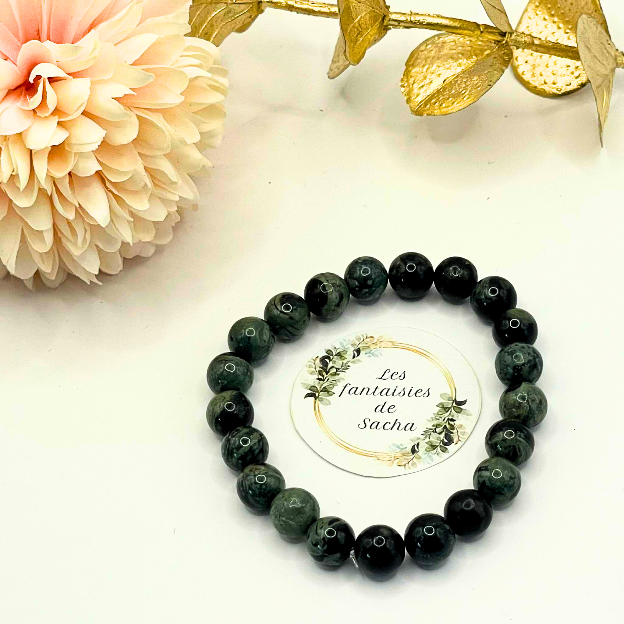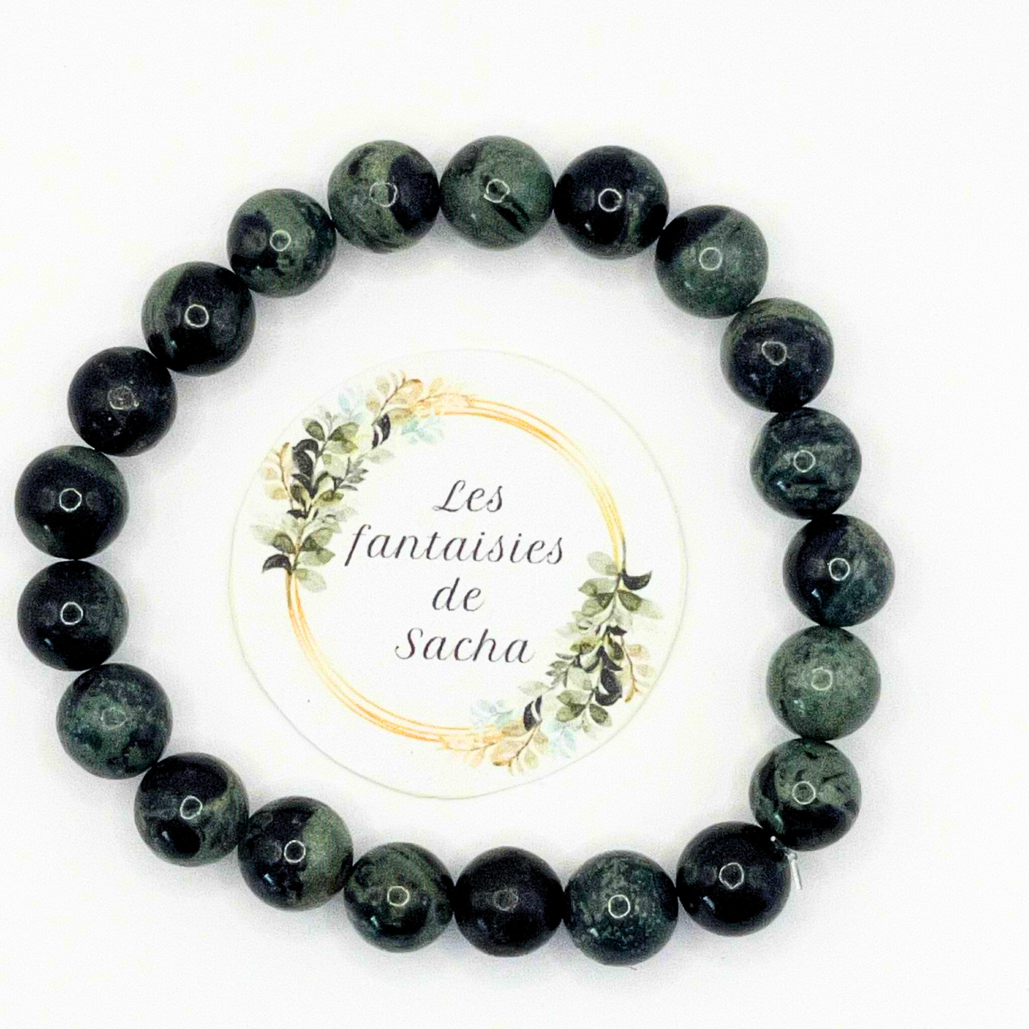Ce « bracelet essentiel » de la boutique Les fantaisies de Sacha est composé de perles de 8 mm en pierre naturelle de jaspe kambaba. Il est monté sur un fil élastique résistant, ce qui lui permet de s’adapter à la plupart des poignets pour un confort optimal. (taille de bracelet standard entre 16 et 18 cm, possibilité d’ajuster sur simple demande via le formulaire de contact).