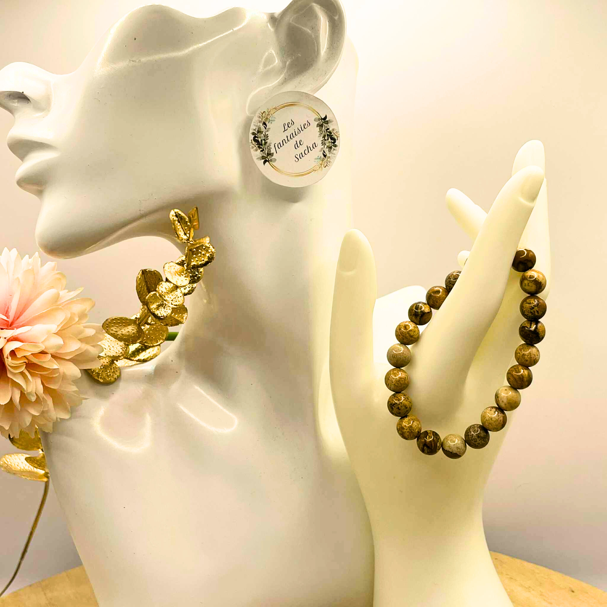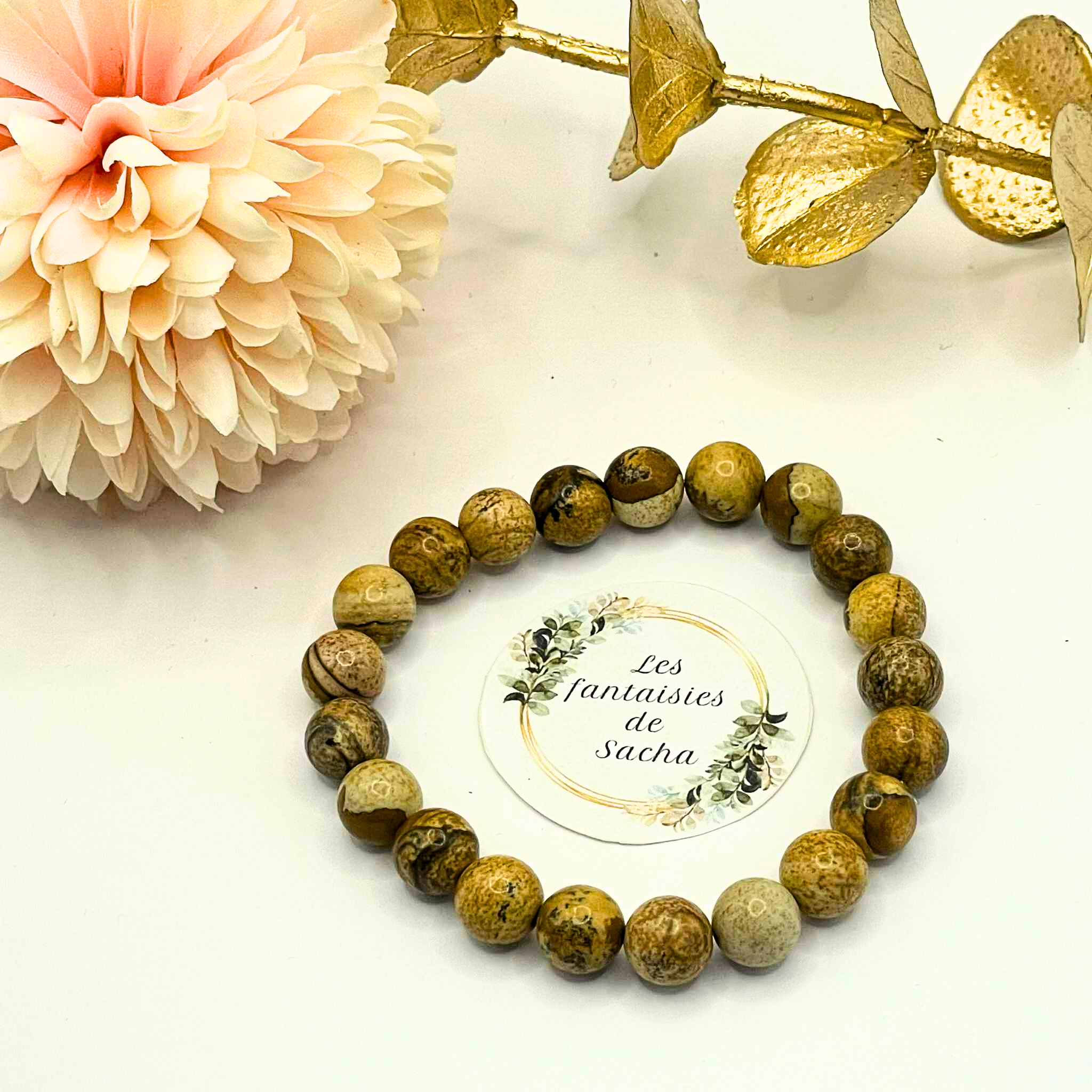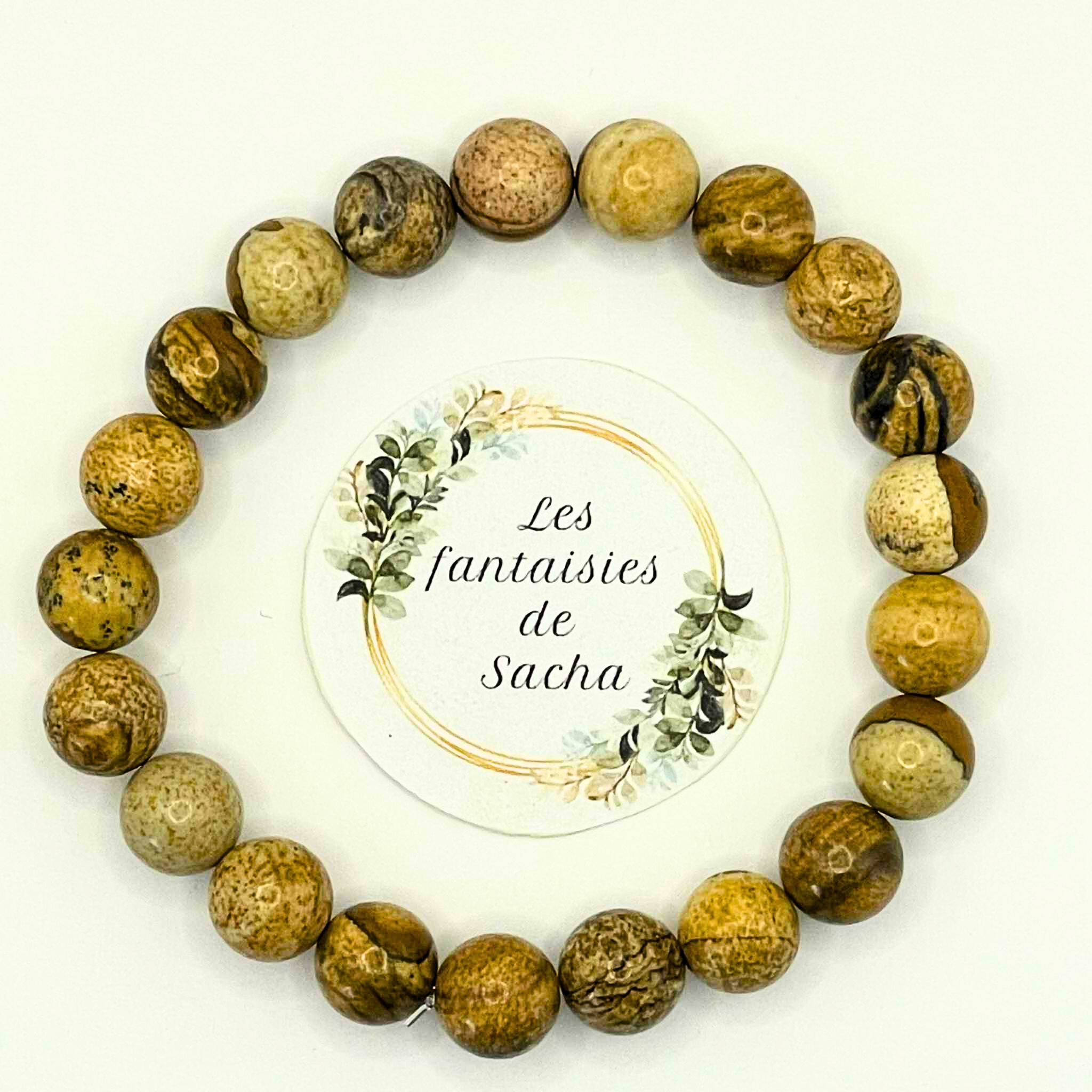 Ce « bracelet essentiel » de la boutique Les fantaisies de Sacha est composé de perles de 8 mm en pierre naturelle de jaspe paysage. Il est monté sur un fil élastique résistant, ce qui lui permet de s’adapter à la plupart des poignets pour un confort optimal. (taille de poignet standard entre 16 et 18 cm, possibilité d’ajuster sur simple demande via le formulaire de contact).