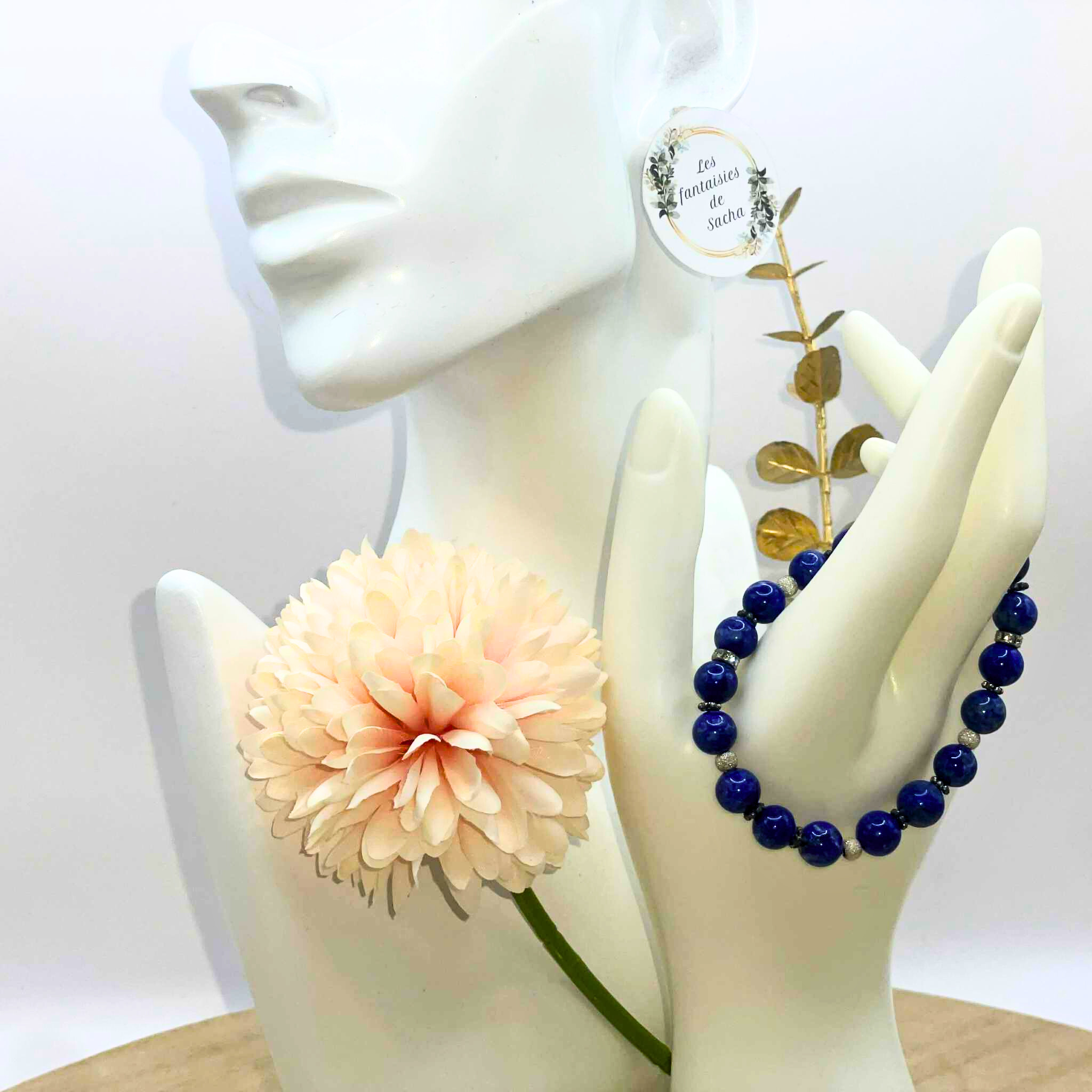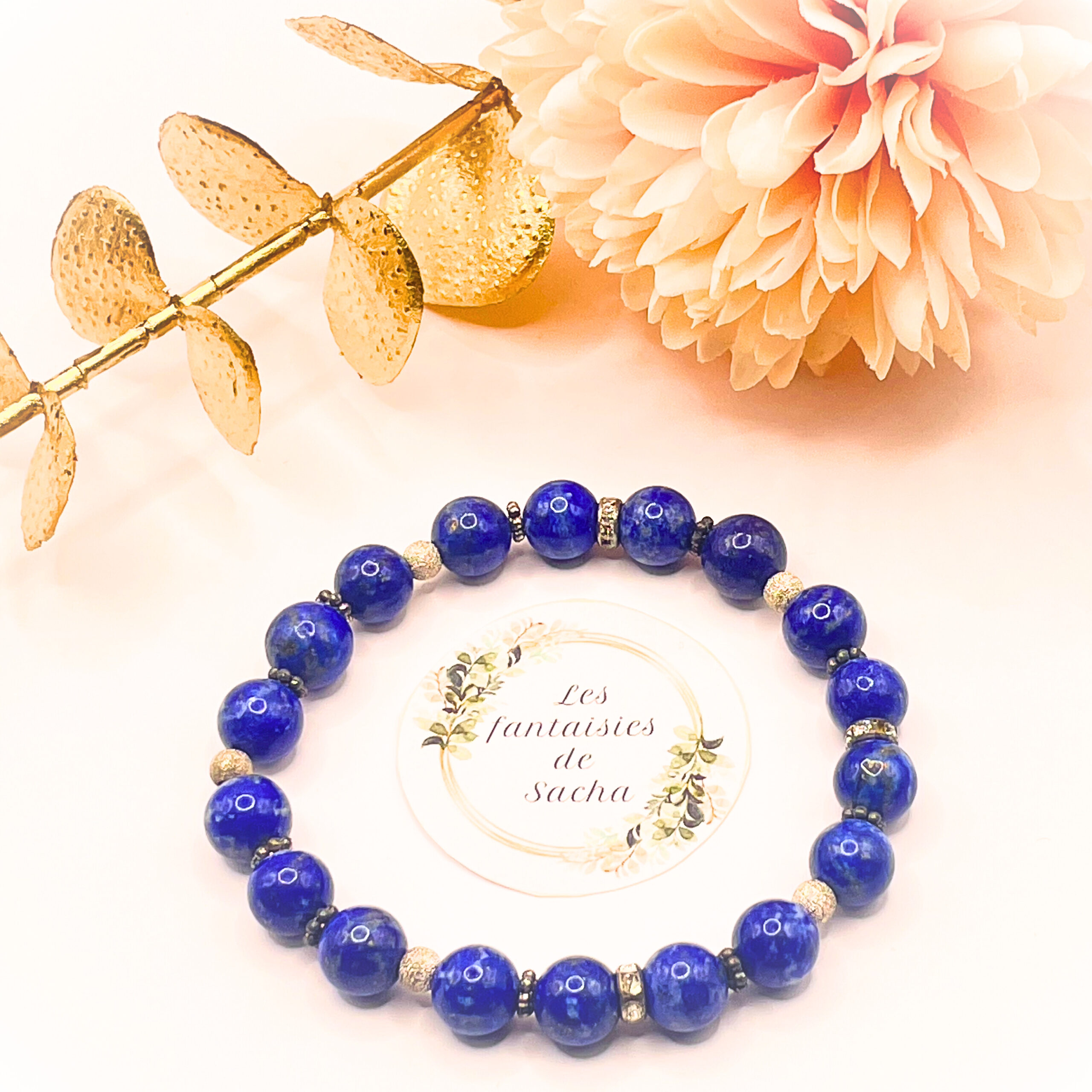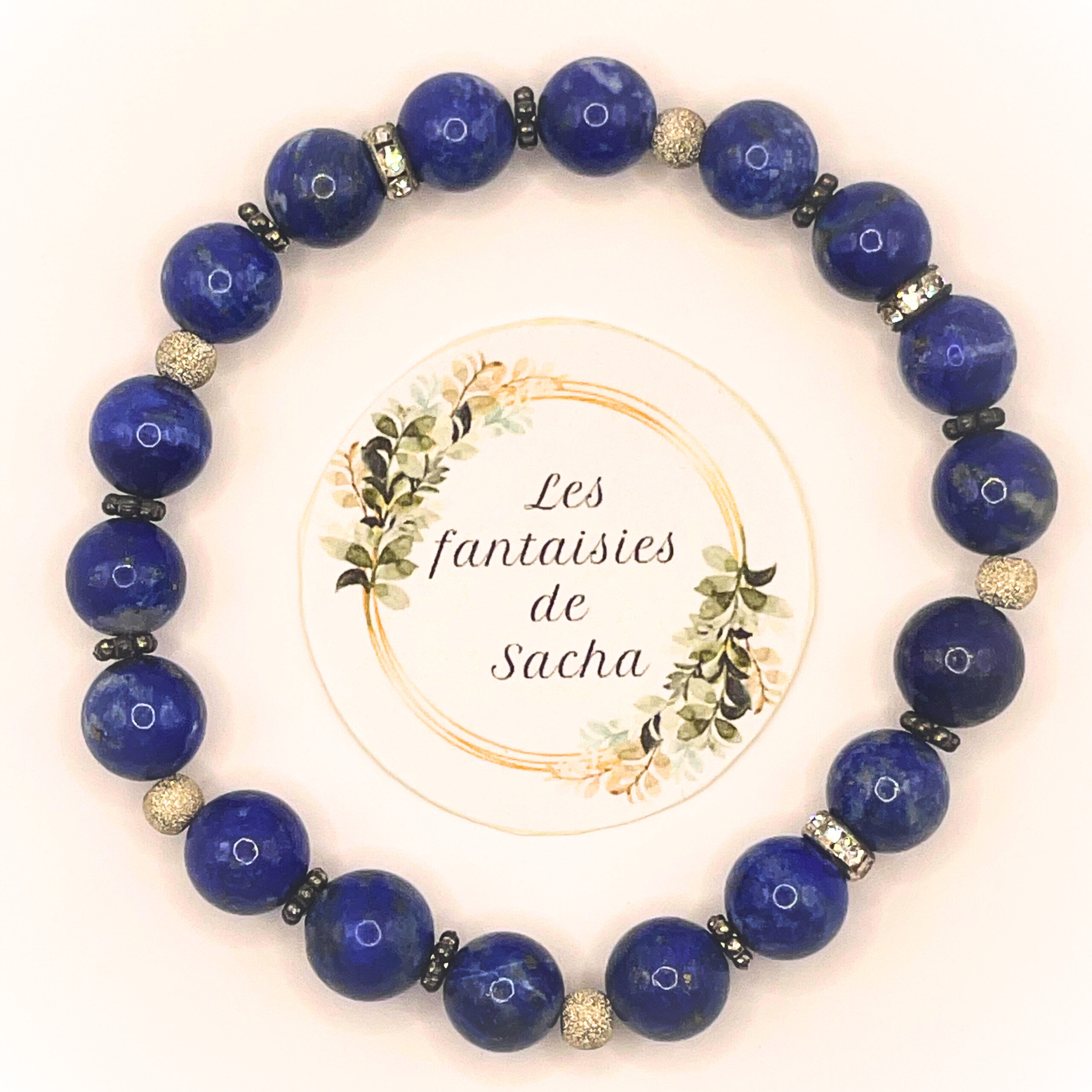 Ce « bracelet essentiel » de la boutique Les fantaisies de Sacha est composé de perles de 8 mm en pierre naturelle de lapis lazuli mais également de perles en argent 925. Il est monté sur un fil élastique.