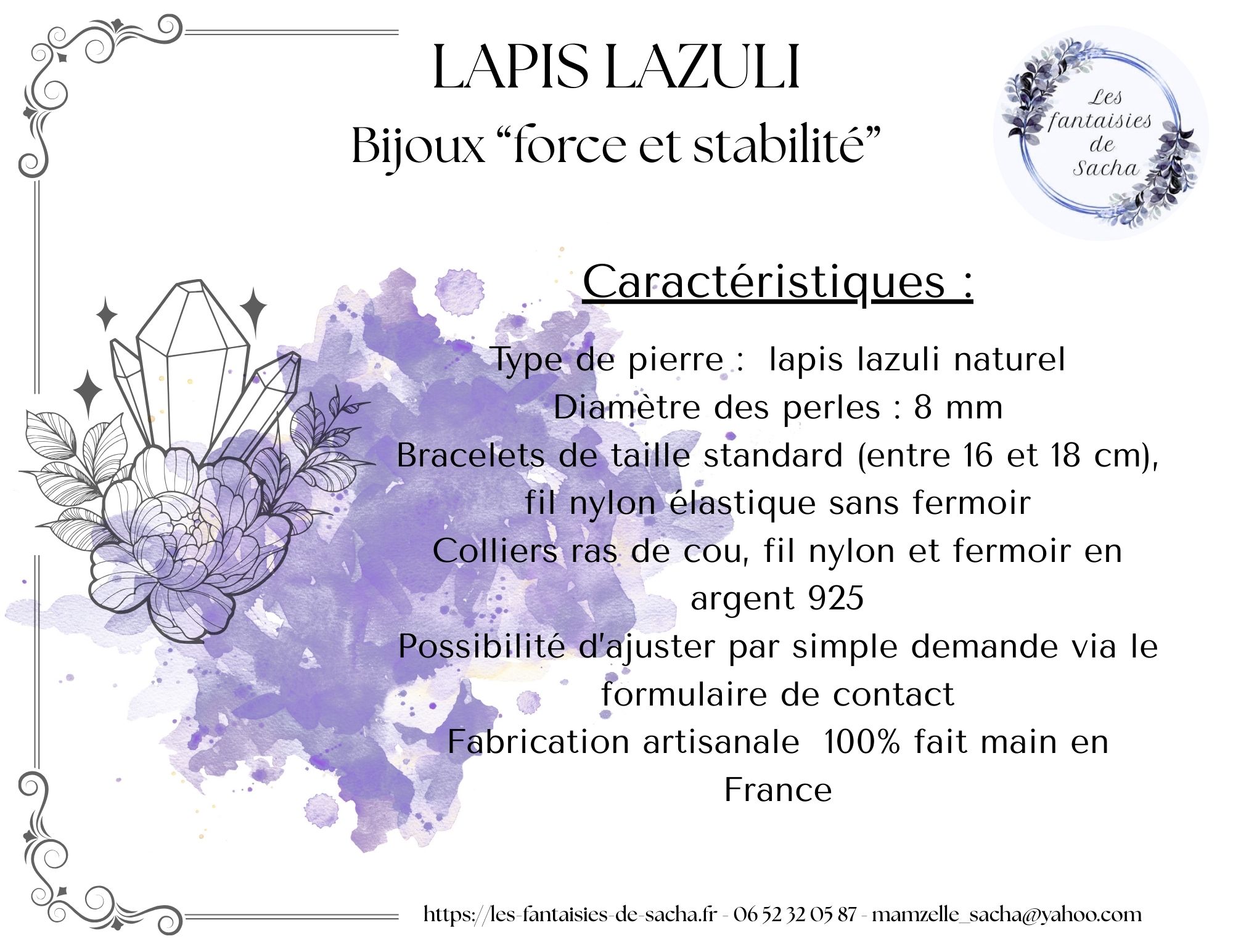 Je suis praticienne certifiée en lithothérapie. N’hésitez pas à me contacter via la rubrique « me contacter » afin de me demander tous les conseils que vous jugerez utiles avant de choisir votre/vos bijoux. Je me ferai un réel plaisir de vous répondre.