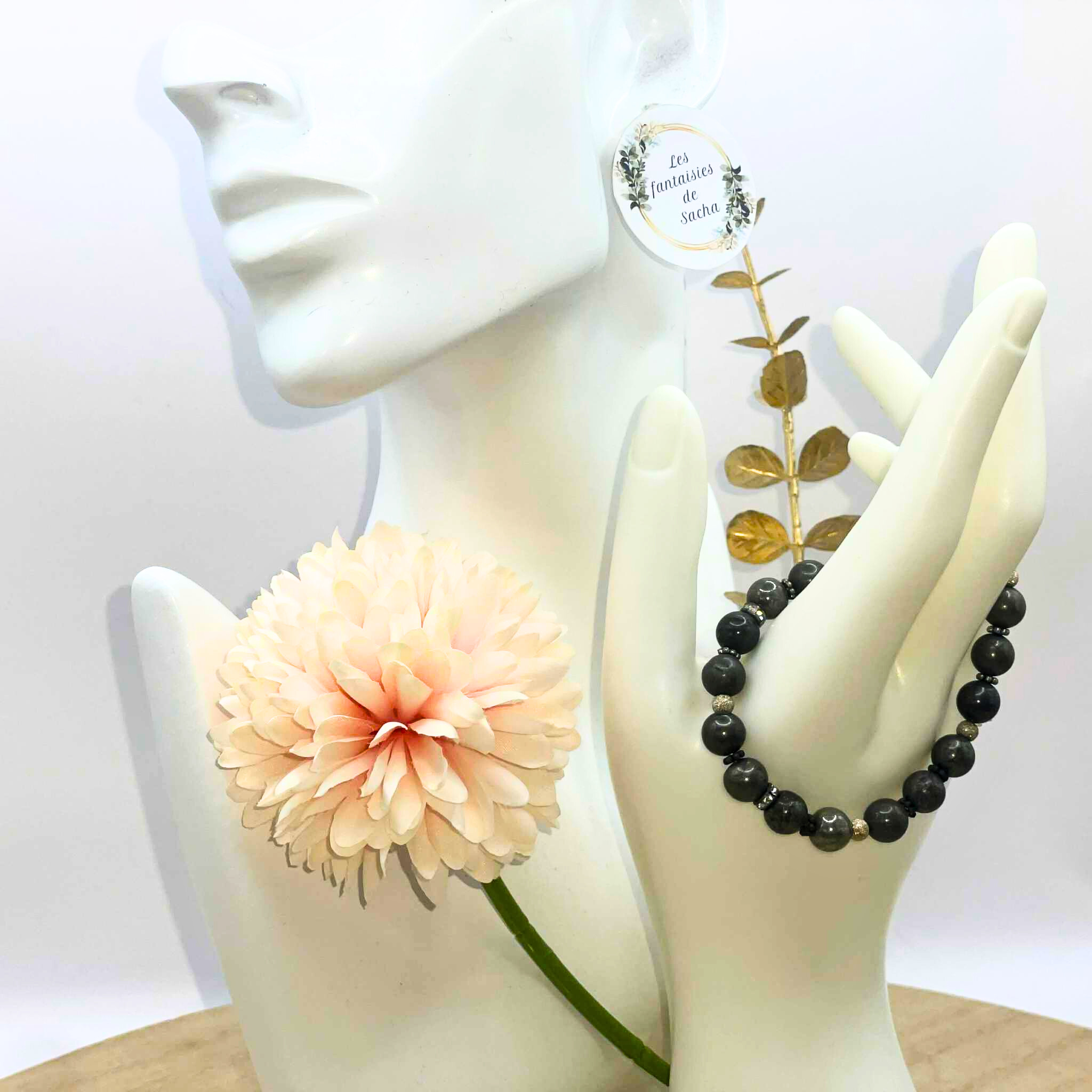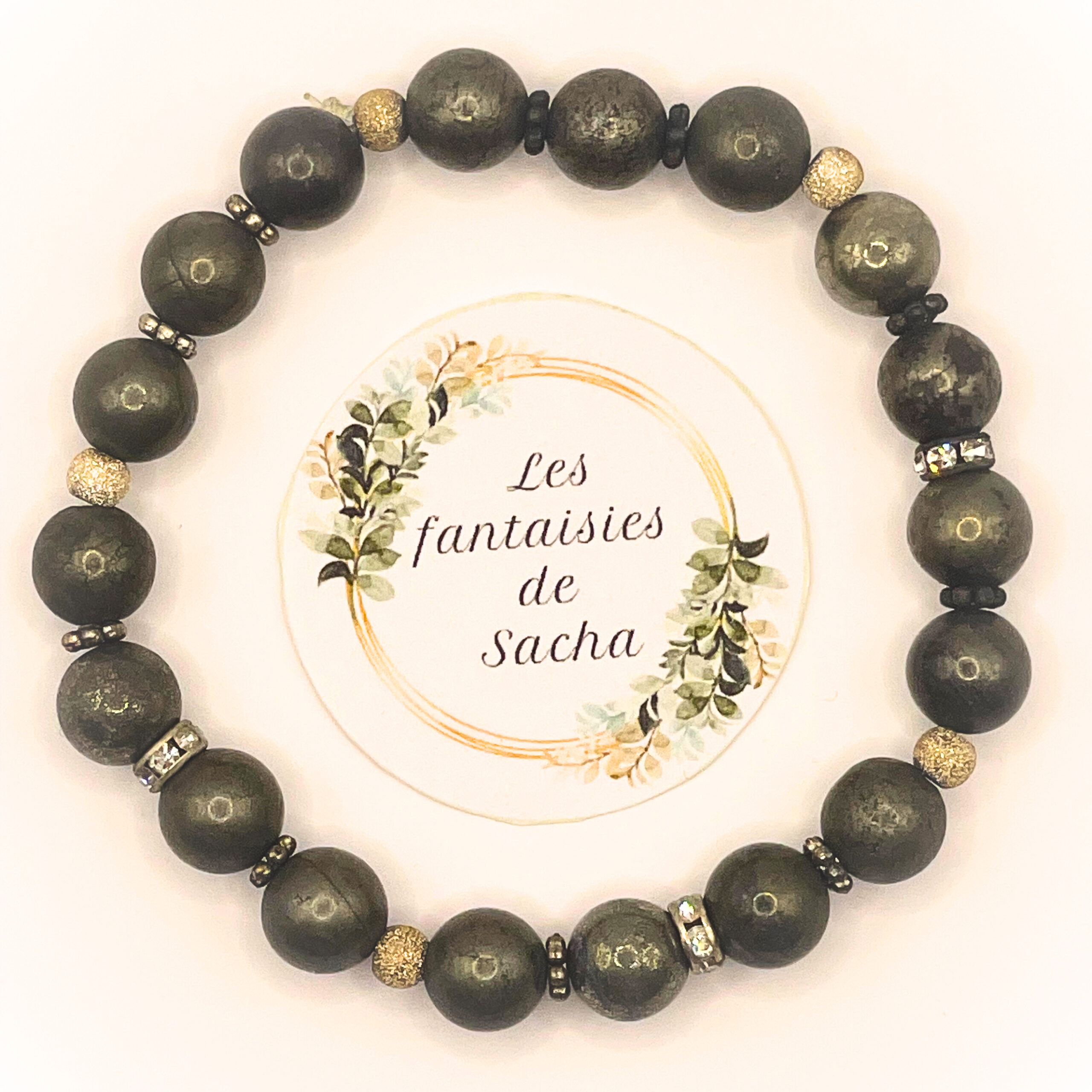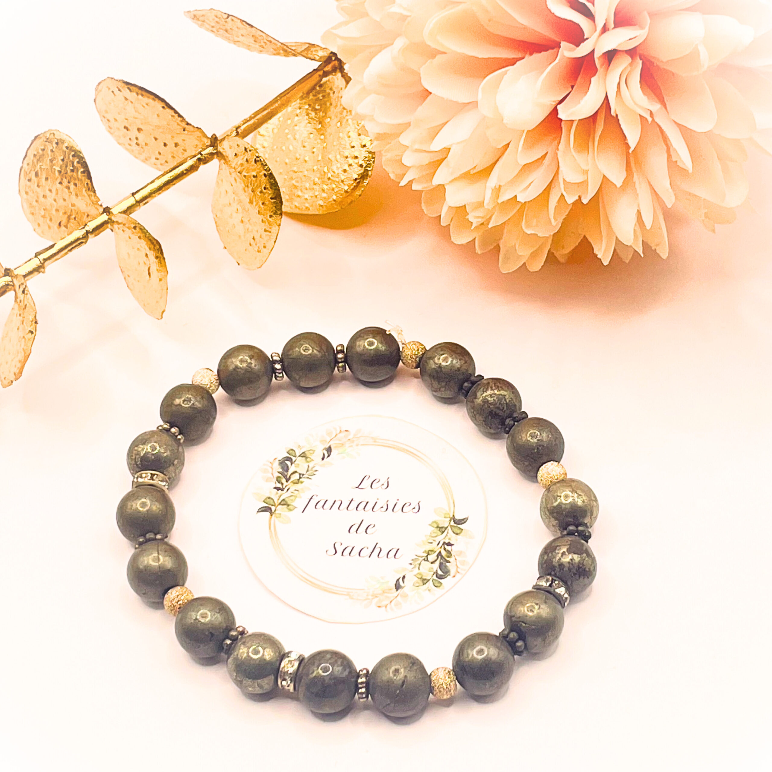 Ce « bracelet essentiel » de la boutique Les fantaisies de Sacha est composé de perles de 8 mm en pierre naturelle de pyrite mais également de perles en argent 925. Il est monté sur un fil élastique.