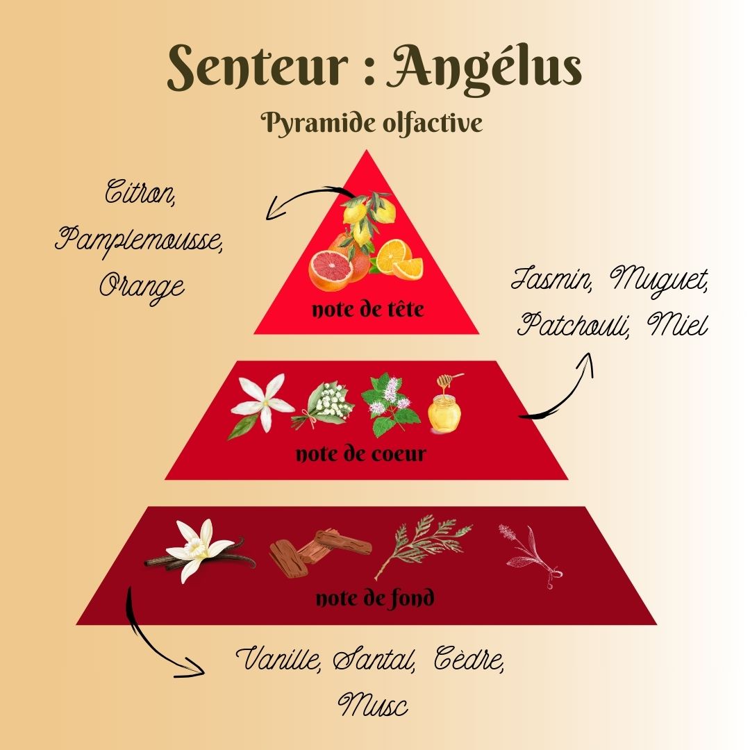 Pyramide olfactive de la senteur Angélus (dupe d’une parfum de grande marque dont vous devinerez facilement le nom) :